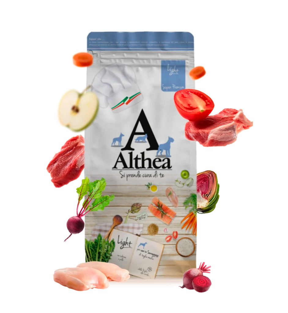 Althea Light is a complete dry food formulated for medium/large sized and overweight adult dogs. Althea brings quality to your dog's bowl. Althea is a complete, balanced, real diet with high nutritional value: proteins, carbohydrates, fats, vitamins, fibers, minerals and natural elements to ensure regular physical and metabolic activity for your senior dog.