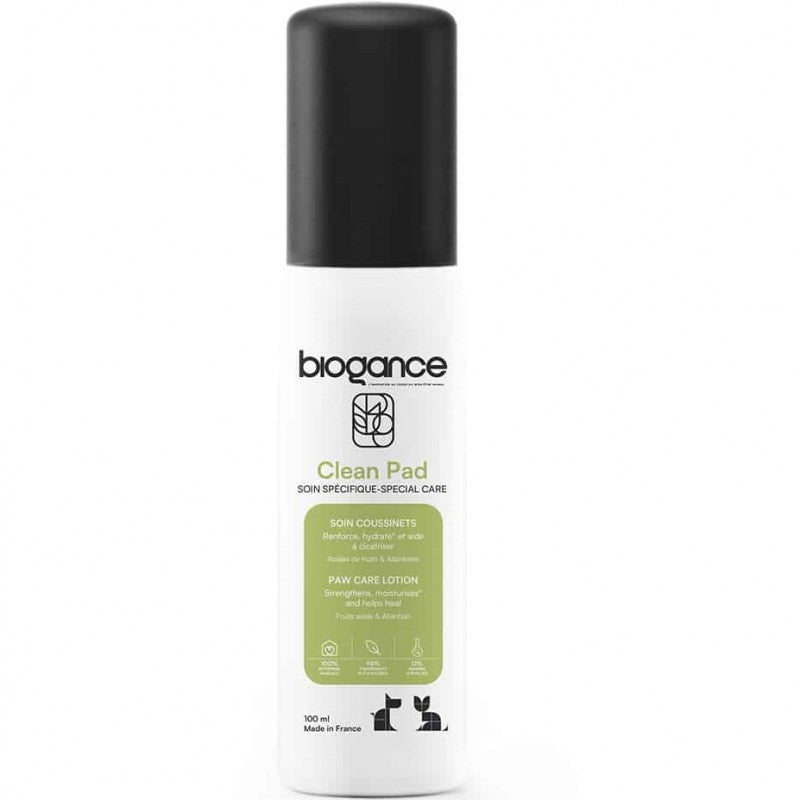 Clean pad - грижа за възглавничките на лапите (100 ml) с плодови киселини за насърчаване на укрепването на възглавничките и богат на алантоин, съставка с лечебни свойства, получена от растения. Подпомага укрепването на възглавничките. Помага за зарастване на малки рани и ожулвания, дехидратира възглавничките. Формата му на лосион позволява по-бързо изсъхване от балсама.