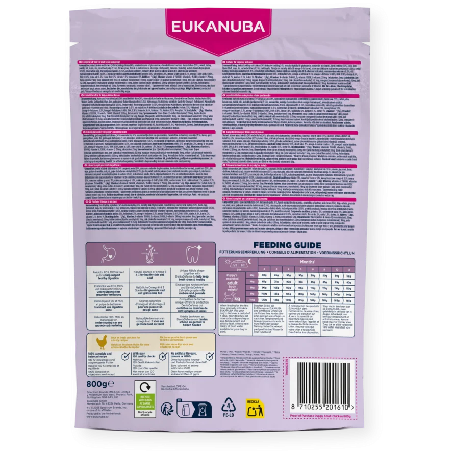 Кученцата от малките породи изгарят повече калории и се нуждаят от повече енергия на килограм телесна маса в сравнение с кученцата от едрите породи. Тази система на Eukanuba осигурява нужните протеини, мазнини и въглехидрати, които да посрещнат техните нужди. Тя осигурява всички важни витамини и минерали необходими за оптимален растеж. Съдържа висококачествени съставки и високи нива на животински протеин, с пилешко като главен източник.