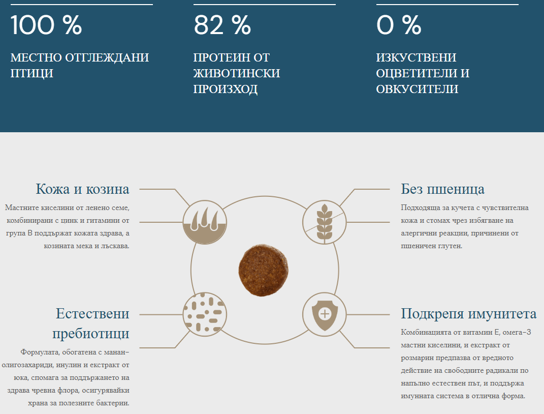 Ingredients : Chicken meat meal 30%, whole grain corn, poultry fat (preserved with a mixture of tocopherols), whole grain barley, whole grain oats, chicken hydrolyzate, dried beet pulp, yeast, linseed, monosodium phosphate, inulin (naturally extracted from chicory roots), potassium chloride, mannan - oligosaccharides (200 mg/kg), yucca extract (100 mg/kg). Additives/1 kg: nutritional supplements: Vitamin A – 15,000 IU, Vitamin D – 1,250 IU, Vitamin E – 150 mg, Vitamin B2 – 4.2 mg, niacin (3a314) – 21 mg, calcium – D - pantophenate ( 3a841) – 12.5 mg, biotin (3a880) – 0.17 mg, iron (iron (II) sulfate monohydrate) – 41.7 mg, iodine (calcium hydrate anhydrous) – 1.25 mg, copper (copper (II ) sulfate pentahydrate) – 4.2 mg, manganese (manganese (II) oxide) – 16.7 mg, zinc (zinc sulfate monohydrate) – 75 mg, selenium (sodium selenate) – 0.08 mg. Technological additives: EU approved antioxidants tocopherol extract from natural fats (1b306(i)). Analytical composition : crude protein - 26%, crude oils and fats - 15%, crude ash - 6.5%, crude fiber - 2.5%, calcium - 1.4%, phosphorus - 0.9%, Omega 3 - 0.32%, Omega 6 – 2.6%. Feeding instructions: serve dry. Always heat enough drinking water. Introduce the new product gradually over at least five days, gradually increasing the daily dose until the recommended dose is reached. Ration table: Weight of an adult dog, [kg] Daily ration, [g/day] 2-5 46 – 91 5-10 91 – 174 10-15 174 – 207 15-20 207 – 257 20-25 257 – 304 25 -30 304 – 348 30-40 348 – 432 40-50 432 – 511 50-60 511 – 586 The quantities in the table are indicative and must be adapted to the individual needs of the dog. Storage conditions: To be stored in a cool, dry place, protected from the sun 78% protein of animal origin