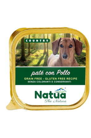 NATUA пастети с парчета пилешко месо, формулирани да осигурят повишено хранително ниво благодарение на висококачествено месо и използването на избрани съставки. Без зърнени добавки и глутен и съдържат средно 60% месо.