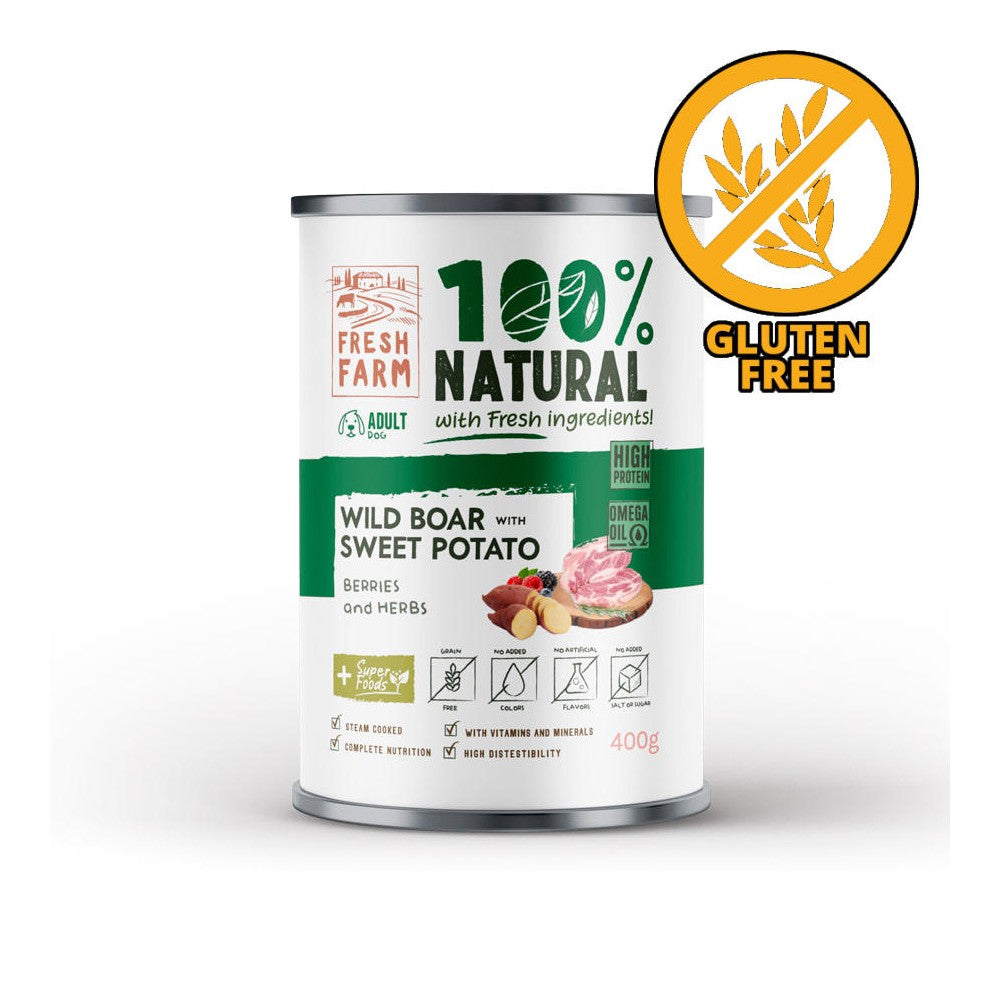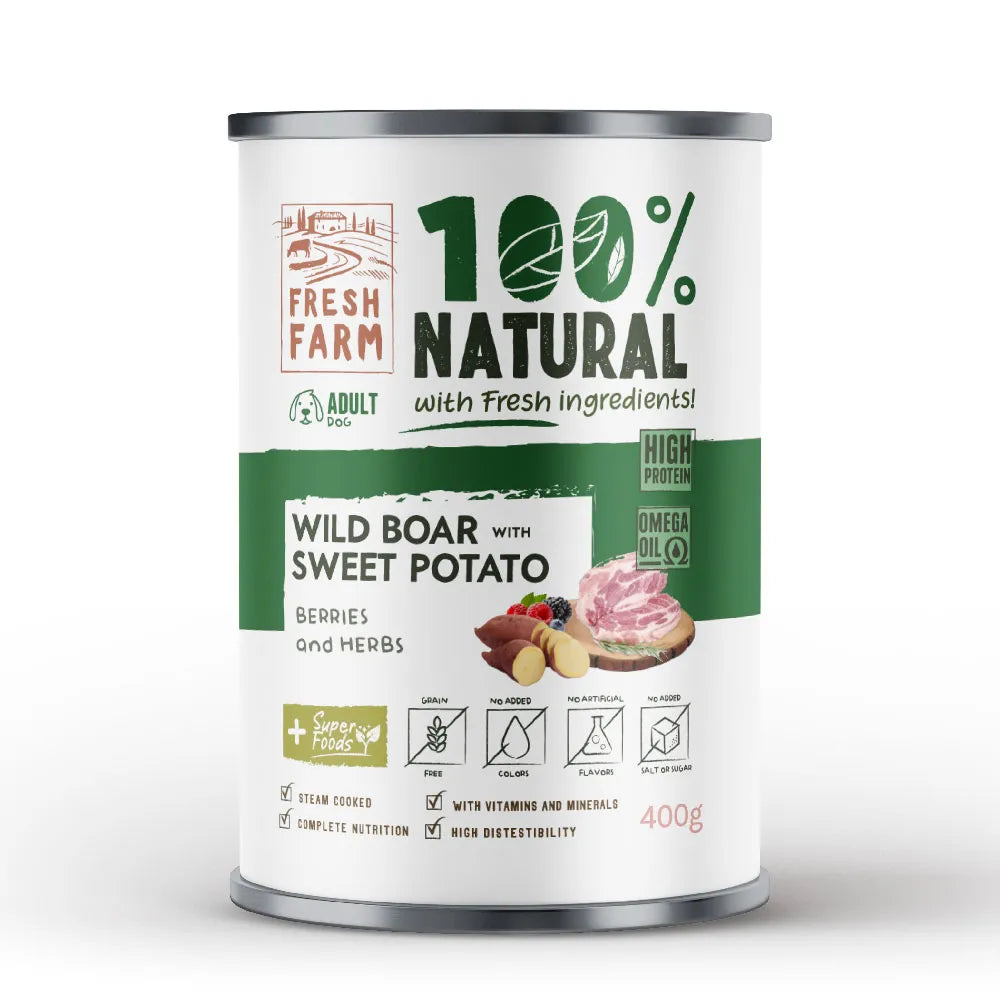 • СЪСТАВ: 28% дива свиня, 25% пиле, 7% сладки картофи, 2% горски плодове, 1% микс от билки, 1% масло от сьомга, 1% магданоз, 0,5% ленено семе, 0,2% водорасли. ДОБАВКИ/кг: витамин D3 (E671) 200 IU, вит. E (3a370) 150 mg, цинк (3b610) 15 mg, манган (3b510) 3 mg, калциев карбонат 2 mg. АНАЛИТИЧНИ КОМПОНЕНТИ: суров протеин 8,5%, сурови мазнини 5,5%, сурови влакнини 0,3%, сурова пепел 2,7%, влага 78,0%, калций 0,3%, фосфор 0,3%, натрий 0,5%.