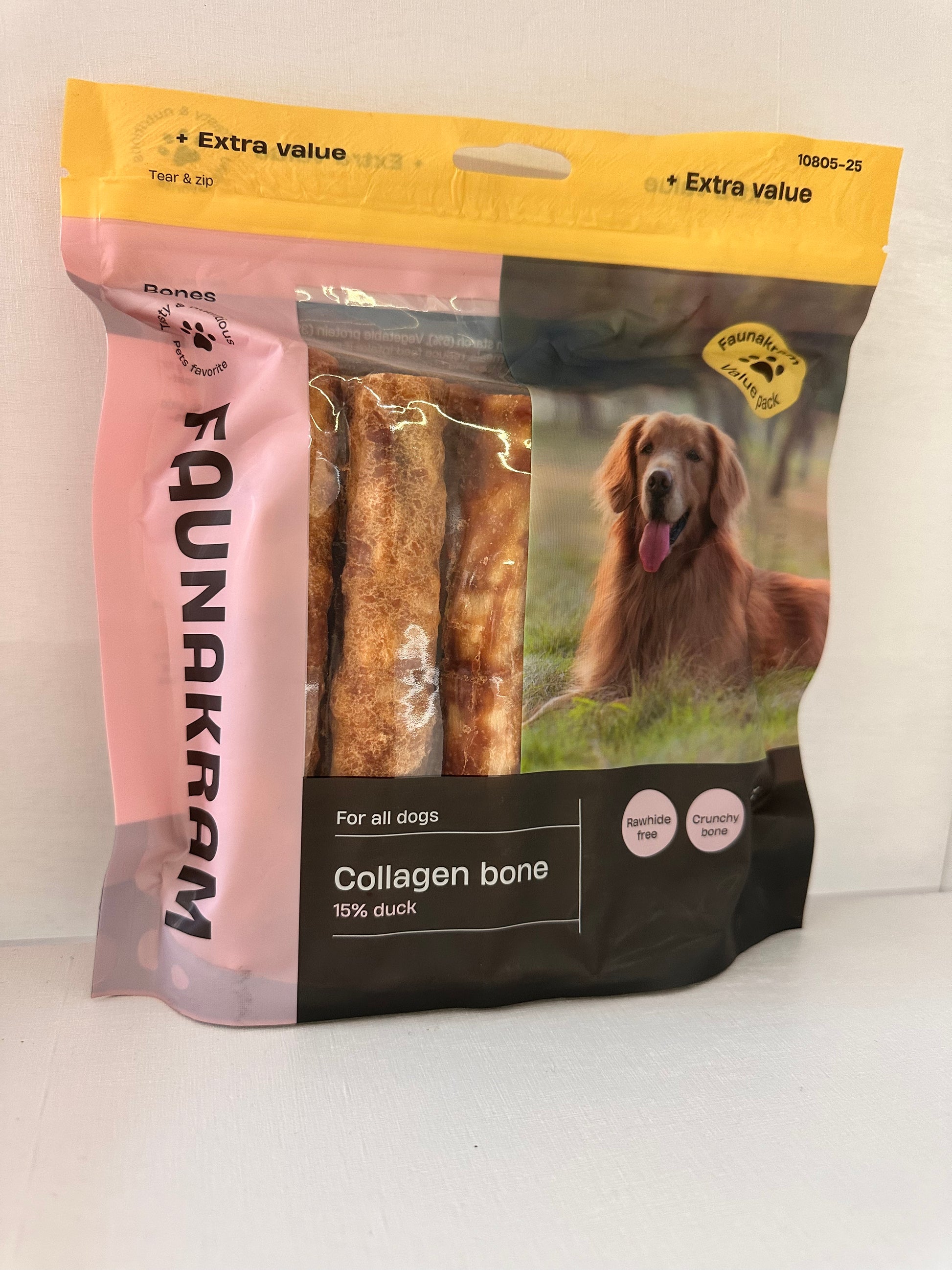 Faunakram Collagen Bone е висококачествено лакомство за кучета, изработено от естествен колаген и обогатено с 15% патешко месо. Продуктът предлага отлична хрупкавост, натурални съставки и безопасна формула – без сурова кожа (rawhide free). Подходящ е за всички породи и размери кучета, осигурявайки продължително забавление и подпомагайки здравето на зъбите и венците. Колагенът допринася и за подобряване функциите на ставите, както и за поддържане на здрава кожа и лъскава козина.