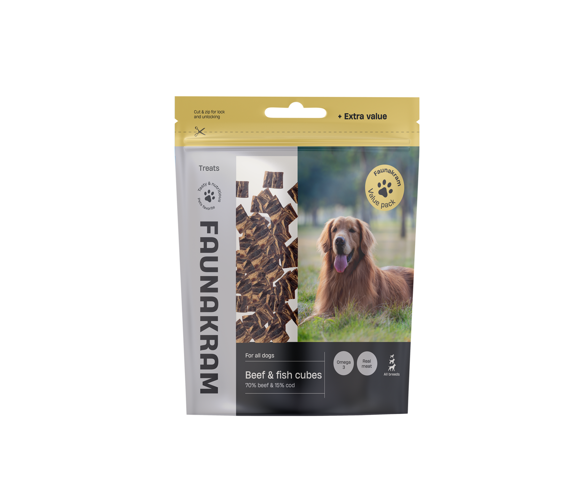 Вкусни лакомства за кучета под формата на кубчета. Съдържат висок процент говеждо месо и треска, които допринасят за балансирано хранене и добра усвояемост. Подходящи за награда между храненията или по време на обучение.