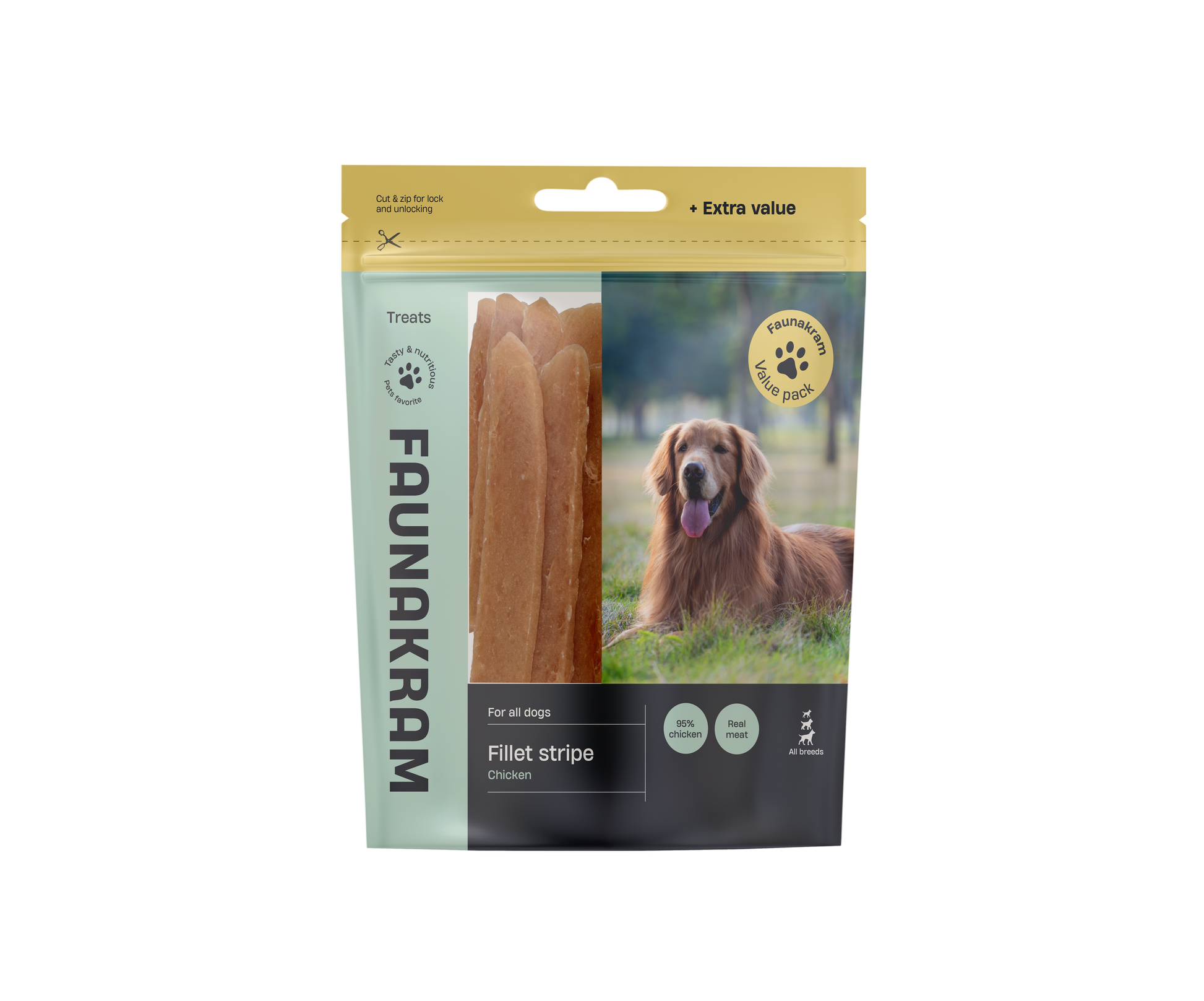 Faunakram Fillet Stripe с пиле 500 гр е перфектното лакомство за вашето куче! С 95% пилешко месо и без изкуствени добавки, то предлага здравословна и вкусна награда. Меката текстура е идеална за дъвчене, а приятният аромат бързо ще привлече вниманието на вашия любимец. Удобната опаковка запазва свежестта.