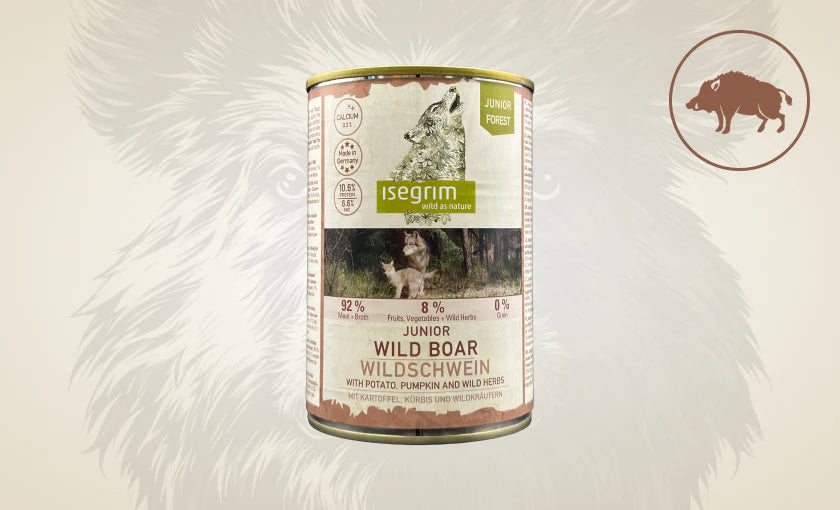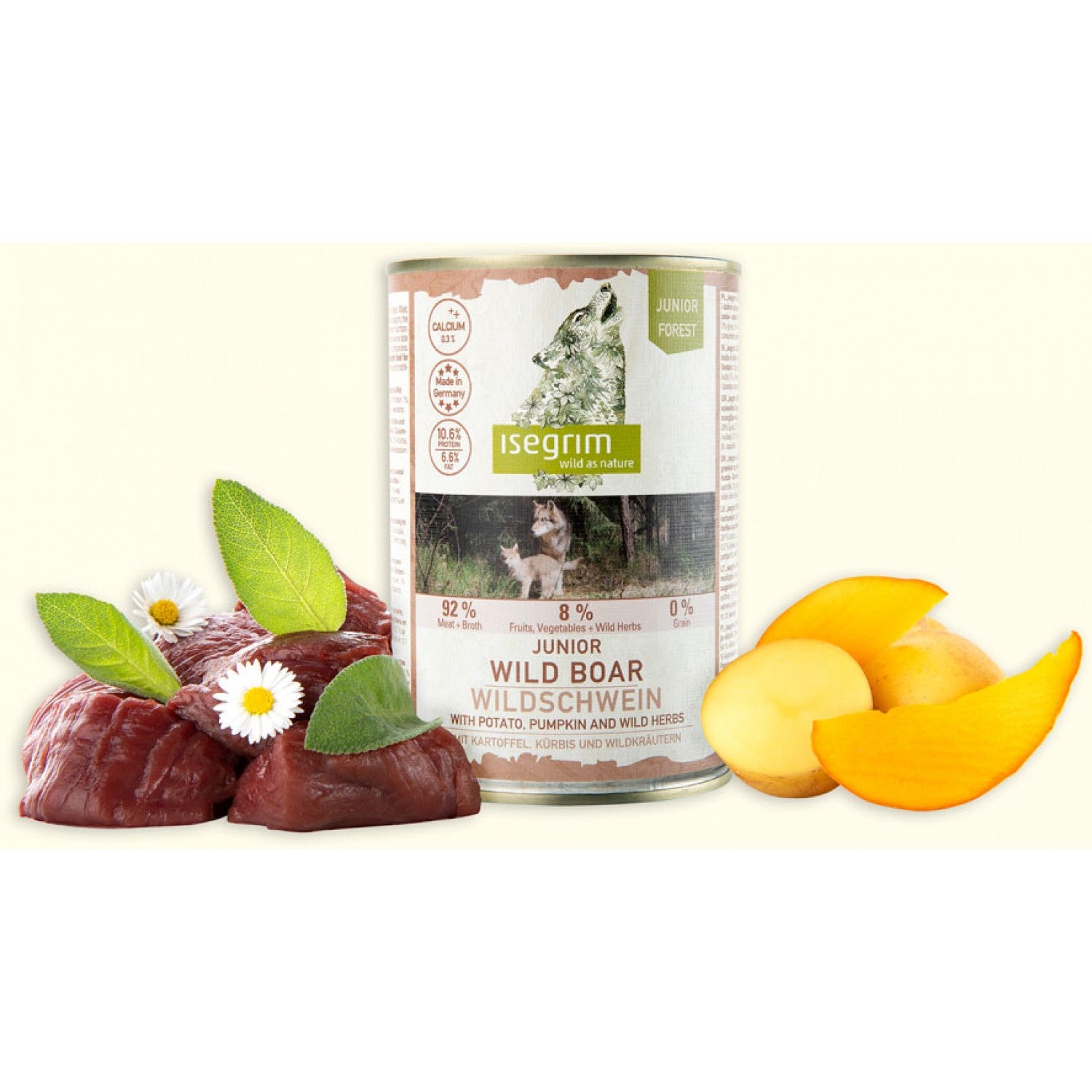 Състав: 64% дива свиня, 28% бульон, 3,7% картофи, 3% тиква, 1% минерали, 0,2% ленено масло, 0,1% диви билки АНАЛИТИЧНИ СЪСТАВКИ: Протеин 10,6%, съдържание на мазнини 6,6%, сурова пепел 2,2%, сурови влакнини 0,5%, влага 75%. ХРАНИТЕЛНИ ДОБАВКИ НА КГ Витамин D3 200 IE/IU, Цинк 25 mg, Манган 1,4 mg, Мед 0,5 mg, Йод 0,75 mg.