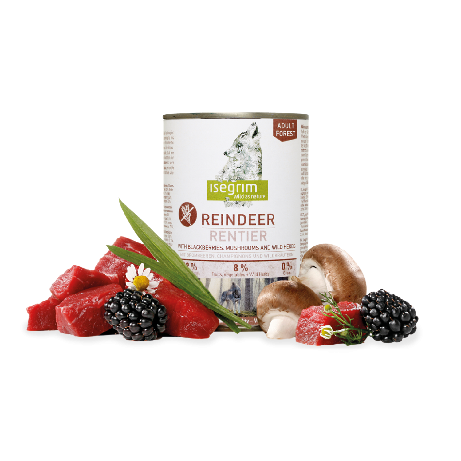 Състав: Месо и животински продукти (63% северен елен), бульон (29%), плодове (3,8% къпини), гъби (3% бели гъби), минерали (1%), билки (0,1%), масла и мазнини (0,1% масло от сьомга). АНАЛИТИЧНИ СЪСТАВКИ: Протеин 10,50%, съдържание на мазнини 6,90%, сурова пепел 2,50%, сурови влакнини 0,50%, влага 75,00%. ХРАНИТЕЛНИ ДОБАВКИ НА КГ Витамин D3 200 I.U., витамин А 3000 I.U., цинк 25 mg, манган 1,4 mg, мед 1 mg, йод 0,75 mg.