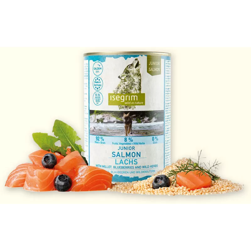 Скандинавско приготвяне на прясна сьомга и прясно птиче месо. Прясната сьомга осигурява основни омега-3 и омега-6 киселини за добро състояние на косата и кожата. В допълнение с вкусно птиче месо, питателно просо, богати на витамини боровинки и диви билки представлява isegrim® Salmon перфектната пълноценна храна за вашето куче.