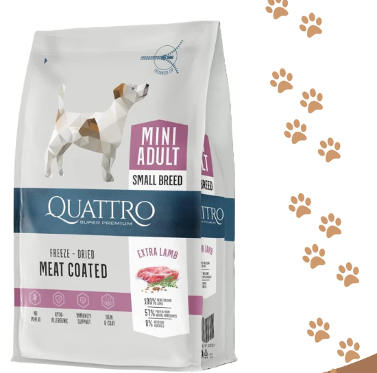 - QUATTRO Mini Adult с Агнешко е отличен избор за собственици, които търсят баланс между високо качество и добър вкус. Технологията с лиофилизирано месо я отличава от масовите марки и я прави подходяща за "злояди" любимци.