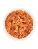 Състав: пилешко месо 41%, пилешки бульон 31%, червен кафяв ориз 10%, моркови 4%, домати 4%, доматено пюре 4%, минерали, рафинирано слънчогледово олио, нишесте от тапиока, прах от куркума 0.05%, прах от джинджифил 0.05%, масло от риба тон. Технологични добавки: Fe (железен (II) сулфат монохидрат) 15 mg, Zn (цинков оксид) 22 mg, Mn (манганов (II) оксид) 4.5 mg, Cu (меден(II) хелат на глицин хидрат) 2.4 mg, I (калиев йодид) 0.9 mg,